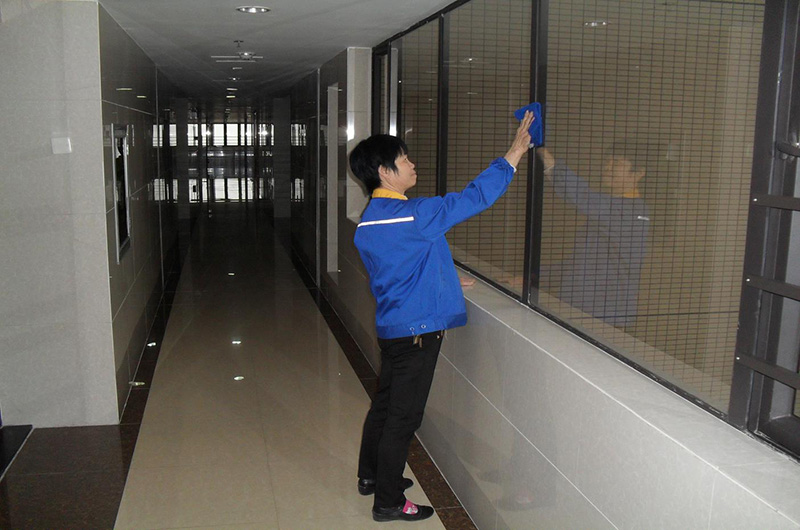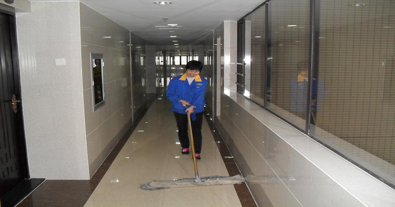 保潔員在樓道現(xiàn)場(chǎng)保潔